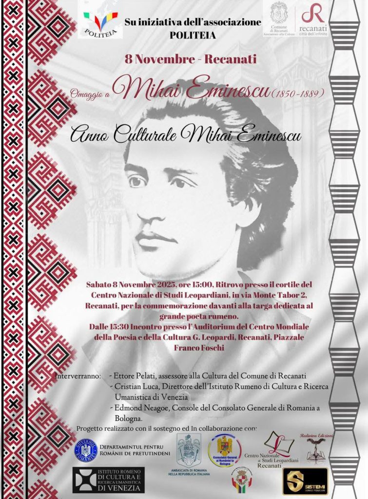 Il programma prenderà avvio alle ore 15 nel cortile del Centro Nazionale di Studi Leopardiani (via Monte Tabor 2), con un momento di commemorazione davanti alla targa dedicata al poeta romeno, posta proprio nel luogo simbolo della poesia leopardiana. A seguire, dalle ore 15:30, l’iniziativa si sposterà all’Auditorium del Centro Mondiale della Poesia e della Cultura “Giacomo Leopardi” (piazzale Franco Foschi), dove si terrà un incontro di riflessione e confronto sui legami culturali tra Italia e Romania, nel segno della poesia e del pensiero umanistico europeo. Tra gli ospiti interverranno Ettore Pelati, assessore alla Cultura del Comune di Recanati, Cristian Luca, direttore dell’Istituto Romeno di Cultura e Ricerca Umanistica di Venezia, e Edmond Neagoe, console del Consolato Generale di Romania a Bologna.