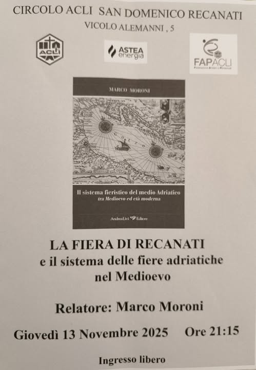 Organizzata dal Circolo ACLI San Domenico Recanati – Vicolo Alemanni,5 (Centro Storico) con il supporto dell’ACLI e FAP Provinciale e ASTEA Energia , il Prof. Marco Moroni presenterà il libro “La Fiera di Recanati e il sistema delle Fiere Adriatiche nel Medioevo” , Giovedì 13 Novembre 2025 ore 21:15 ingresso libero.