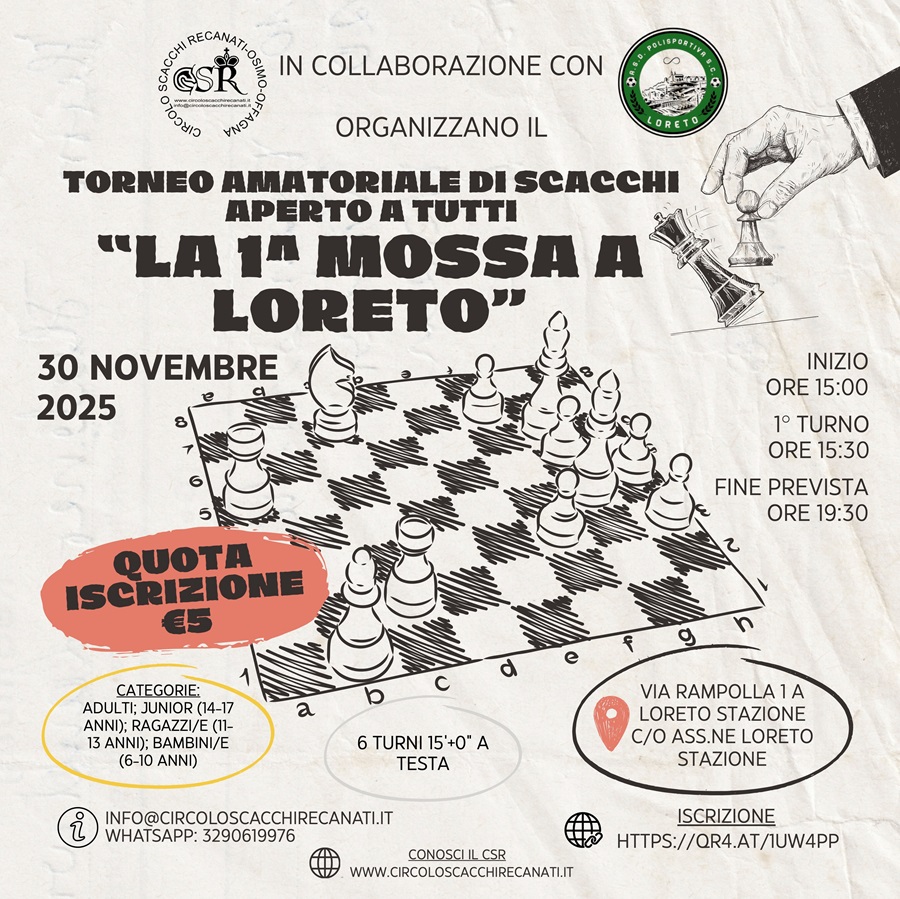 Per gli appassionati e gli adulti del Circolo, il CSR si unisce all’ASD Polisportiva Loreto per il 1° Torneo Amatoriale di Scacchi “La 1ª Mossa a Loreto”.