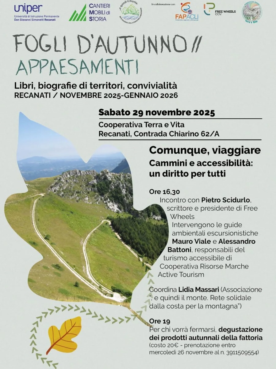 Sabato 29 novembre, alle ore 16.30, nei locali di Terra e Vita (Chiarino di Recanati), si terrà un incontro nell’ambito dell’iniziativa “Fogli d’autunno” (promosso da Uniper Recanati, Cantieri Mobili di Storia, associazione “, e quindi il monte” e in collaborazione con FAPAcli): parteciperanno Pietro Scidurlo, scrittore e presidente di Free Wheels, e Mauro Viale e Alessandro Battoni, guide ambientali; il coordinamento è affidato a Lidia Massari.