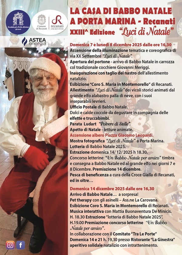 A Recanati Natale non è Natale senza il Babbo Natale di Porta Marina sempre pronto con il suo sorriso per accogliere grandi e piccini. Quest’anno il Comitato ha scelto il tema della Luce che è vita e calore e che deve risplendere per tutti. Si parte il giorno 7 dicembre alle ore16,30 questo il programma di domenica 7 e lunedi’8 dicembre 2025