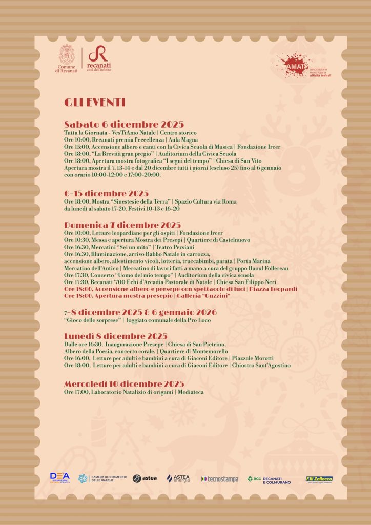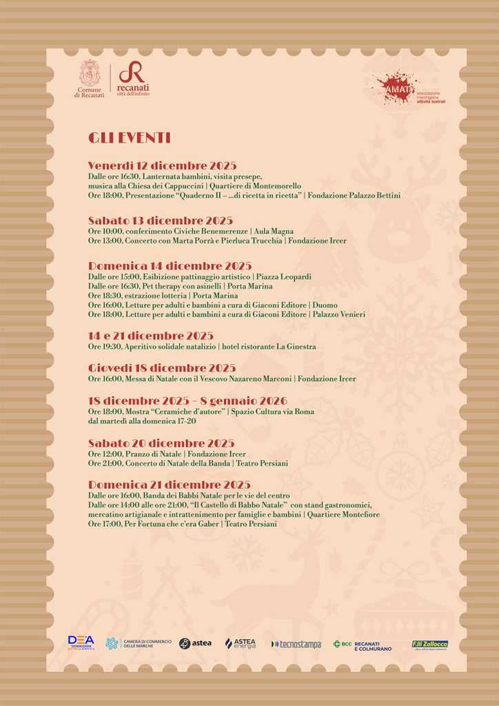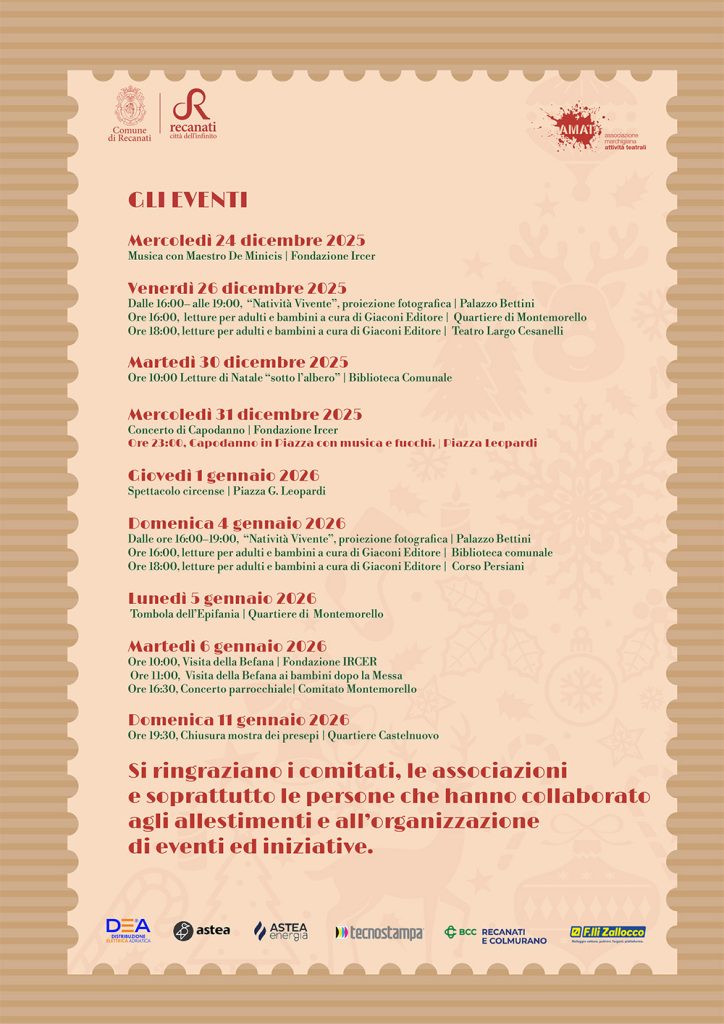 Il cartellone è stato realizzato grazie alla compartecipazione di partner e aziende del territorio, che hanno finanziato la sua realizzazione, tra cui Amat, Astea, Astea Energia, BCC Recanati e Colmurano, Camera di Commercio delle Marche, DEA, Fratelli Zallocco e Tecnostampa. Il calendario completo degli eventi è disponibile sul sito e sui canali social ufficiali del Comune di Recanati.