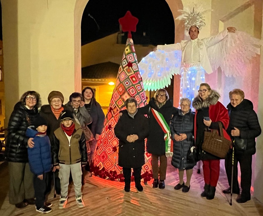 Il cuore pulsante della giornata è stato illuminato da due simboli natalizi. Al centro della piazza, un maestoso albero ha preso vita, avvolto da una miriade di luci che hanno adornato ogni suo ramo, sopra di esso un vero e proprio cielo stellato formato dalle nuove luci natalizie acquistate dal Comune. Poco distante, sotto le logge dell’ex Palazzo Comunale, è stato presentato un secondo albero, più piccolo ma ugualmente significativo, realizzato interamente all’uncinetto dalle nonne del Centro Anziani, guidate dall’associazione AVULSS. Questo progetto, nato la scorsa primavera e ispirato dalla collaborazione di Graziella Coltrinari, ha visto le mani esperte di queste donne assemblare innumerevoli mattonelle colorate, esposte con orgoglio come emblema della creatività e del prezioso impegno comunitario.