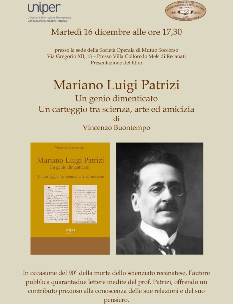 Carissimi, nell’ambito del percorso di ricerca volto a valorizzare il patrimonio umano e culturale che Recanati ha saputo esprimere nei secoli, l’UNIPER è lieta di invitarvi alla presentazione del volume di Vincenzo Buontempo dedicato a Mariano Luigi Patrizi, scienziato recanatese di straordinario valore.