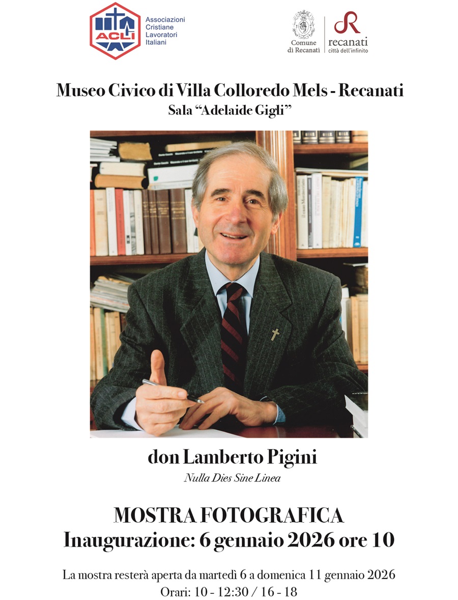Per il quinto anniversario del ritorno alla Casa del Padre di don Lamberto Pigini, la famiglia Pigini, in collaborazione con le ACLI di Ancona e Macerata e con il patrocinio del Comune di Recanati, ha organizzato una mostra fotografica dal titolo “Nulla Dies Sine Linea”, richiamando uno dei motti preferiti dal sacerdote-imprenditore e già titolo della biografia, pubblicata nel 2022 da Tecnostampa.
