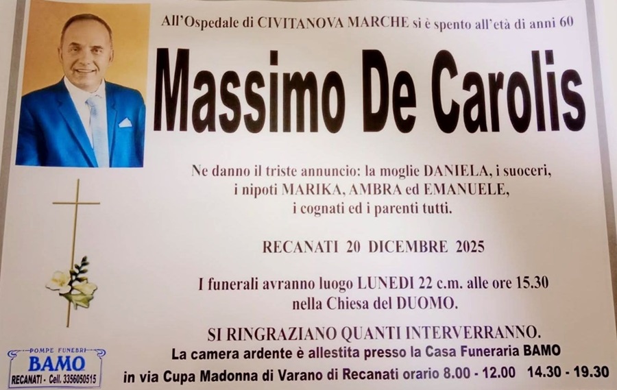 Recanati è ancora sotto shock per la scomparsa di Massimo De Carolis, morto a 60 anni in seguito a un grave incidente. Dopo ore di apprensione e gli accertamenti disposti dall’autorità giudiziaria, nel pomeriggio di oggi è stata eseguita l’ispezione cadaverica, al termine della quale è arrivato il nulla osta per la restituzione della salma ai familiari.