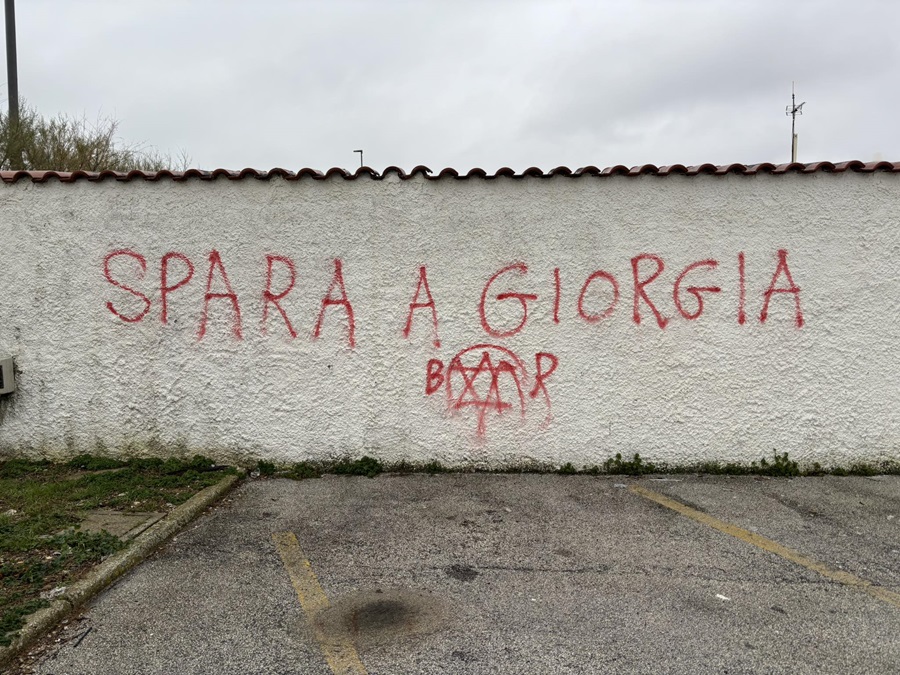 Una scritta dal contenuto gravissimo è apparsa nella giornata di oggi su un muro del parcheggio dell’ex Coco Bar, in zona Scossicci. Con vernice spray rossa è stata tracciata la frase «Spara a Giorgia», accompagnata dalla sigla «Br», un riferimento che richiama uno dei periodi più drammatici della storia italiana.