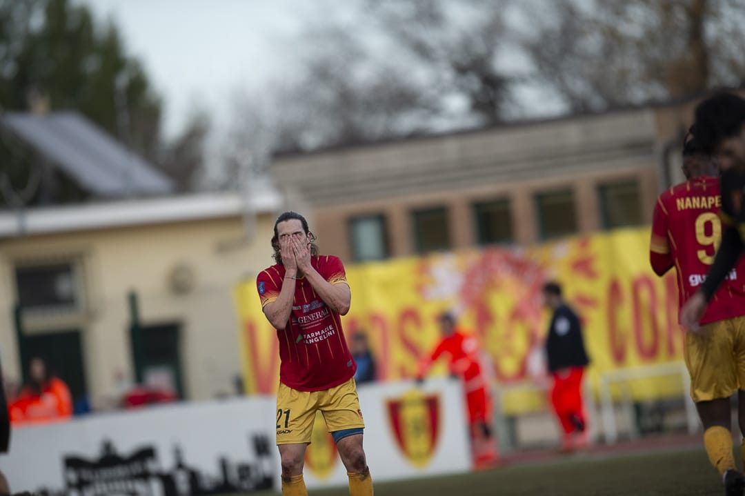 Ripresa. Pagliari cerca di correre ai ripari con diverse sostituzioni ma ad andare ancora vicino al gol sono i romagnoli con il solito Merlonghi che da pochi passi manca il tris grazie alla respinta del portiere. Recanatese che macina inutilmente il possesso di palla fino al ventottesimo quando il subentrato Pesaresi, lanciato in area, a tu per tu con il portiere, viene atterrato. Rigore sacrosanto e trasformazione impeccabile del capitano d’Angelo. I locali insistono e ormai la sconfitta sembra concretizzarsi, specialmente quando viene annullata un’altra rete ai recanatesi dopo l’inzuccata di Pesaresi. Tra le proteste si prosegue e all’ultimo assalto arriva il gol di Pesaresi che sicuramente si è rivelata la mossa più azzeccata di mister Pagliari, riuscendo così ad evitare la quarta sconfitta consecutiva. Un punto acciuffato per i capelli che non può considerarsi soddisfaciente considerato che si giocava in casa contro la penultima in classifica che al di la di tutto si è mostrata agguerrita e con giovani interessanti. Un pareggio che non migliora assolutamente una classifica che resta preoccupante e con un altro scontro diretto all’orizzonte, domenica prossima, al Cannarsa di Termoli.