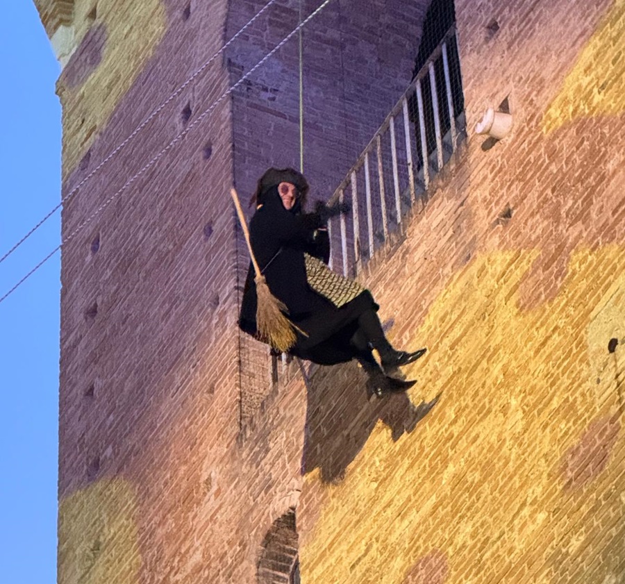 Infine, il tanto atteso arrivo della Befana, finora rimasta nascosta tra le campane della Torre Civica, da cui è scesa per la gioia delle famiglie in attesa in Piazza Leopardi. Si è poi aggirata, inseparabile dalla propria scopa, attraverso la piazza e il loggiato comunale, salutando i piccoli e prendendo parte da protagonista alla festa a lei dedicata, consegnando a tutti altre prelibatezze dal suo sacco.