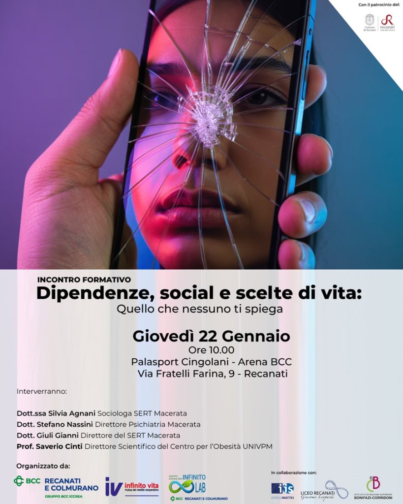 Un momento di confronto e ascolto dedicato alle nuove generazioni, per affrontare in modo chiaro e concreto i temi delle dipendenze e delle scelte di vita. È questo l’obiettivo dell’incontro formativo “Dipendenze, social e scelte di vita: quello che nessuno ti spiega”, in programma domani alle ore 10.00 presso il Palasport Cingolani – Arena BCC di Recanati.