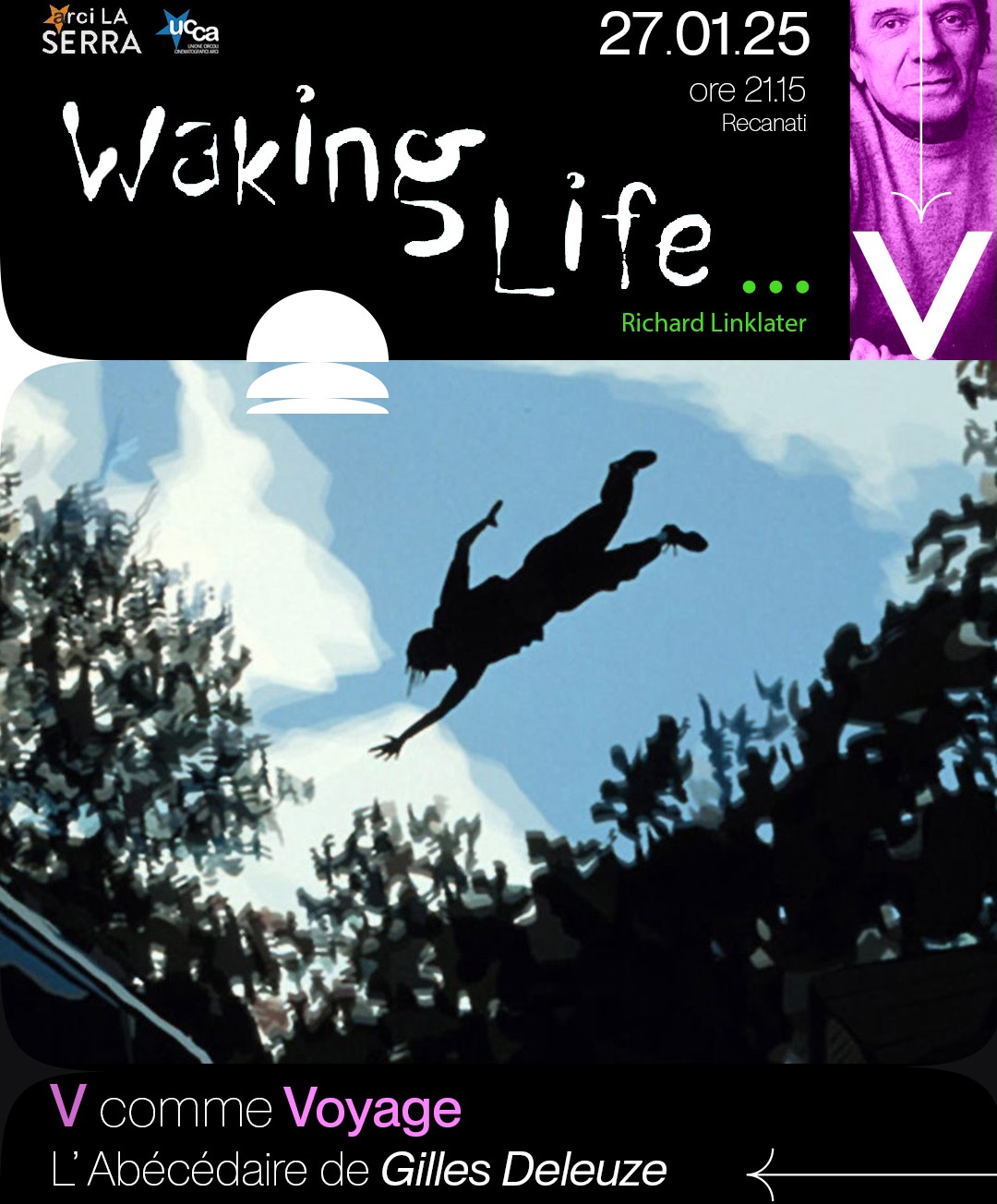 Martedì 27 gennaio alle ore 21:15 il Circolo ARCI/UCCA La Serra di Recanati presenterà la proiezione del film “Waking Life” (2001) di Richard Linklater preceduto dalla lettera “V comme Voyage” della celebre intervista “L’Abécédaire de Gilles Deleuze”, andata in onda postuma nel 1995 sul canale Arté.