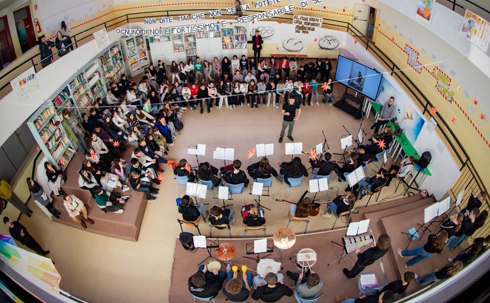 La sezione musicale dell’Istituto ha dato un contributo significativo alle celebrazioni. Nella mattinata del 27 gennaio, nell’atrio della scuola, l’orchestra della “Patrizi” ha eseguito tre brani, uno dei quali accompagnato dal coro. Le classi prime e seconde dell’indirizzo musicale hanno interpretato anche Auschwitz di Francesco Guccini, in un momento particolarmente intenso e partecipato. Nel pomeriggio del 27 gennaio, l’orchestra si è esibita nuovamente in Aula Magna del Comune di Recanati, accompagnando l’evento promosso dall’Istituto Storico di Macerata e dall’Anpi di Recanati, alla presenza degli assessori Pelati e Pergolesi.