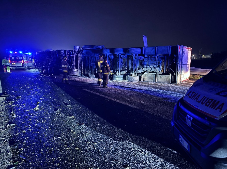 Il tir, per cause in corso di accertamento, ha urtato i blocchi di cemento che separano le corsie di marcia e si è poi ribaltato su un fianco, occupando parte della sede stradale. Non risultano coinvolti altri veicoli: il mezzo avrebbe fatto tutto da solo.