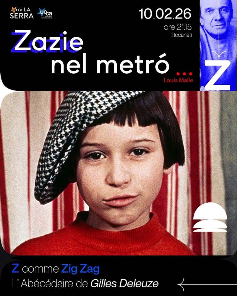 E con “Z comme Zig Zag”, sullo schermo del Circolo ARCI/UCCA La Serra di Recanati il prossimo martedì 10 febbraio alle 21:15, arriverà alla conclusione il ciclo di proiezioni cinematografiche “Deleuze10030”. Per l’occasione, alla lettera Z de “L’Abécédaire de Gilles Deleuze” seguirà un classico della Nouvelle Vague francese come “Zazie nel metrò” (1960) di Loius Malle.