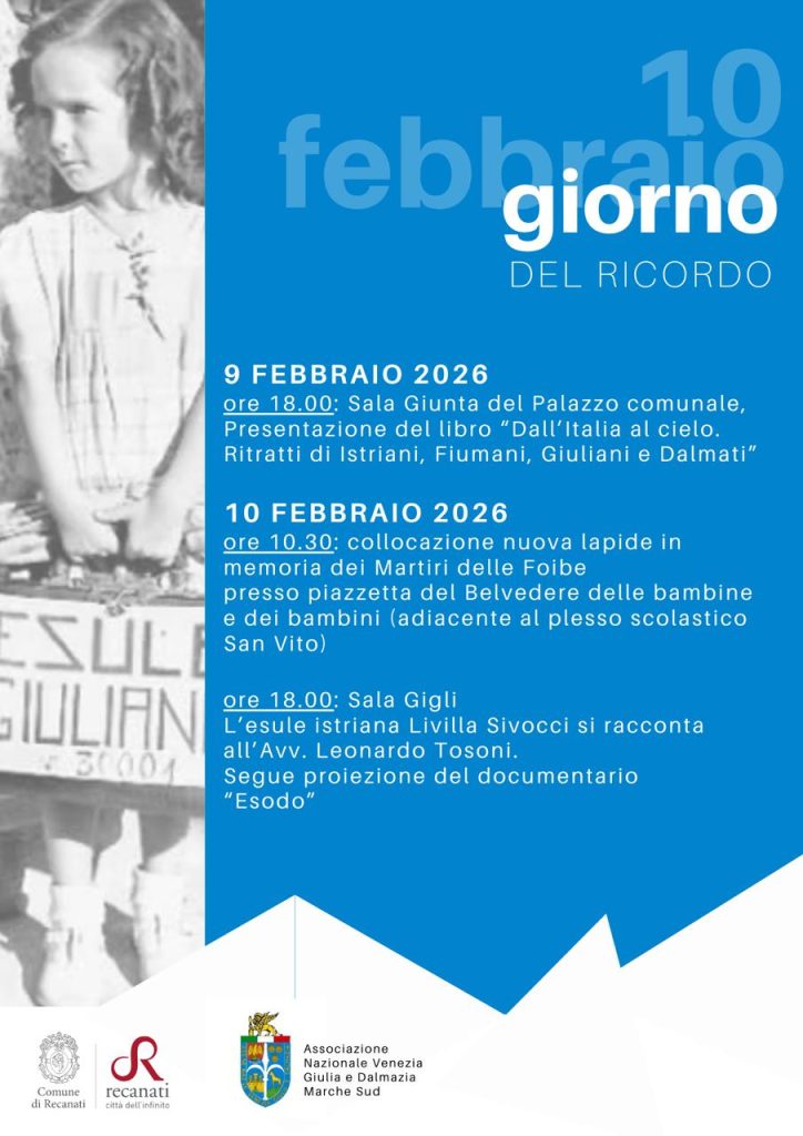 L’Amministrazione comunale di Recanati vuole ricordare gli esuli e le vittime con una serie di iniziative in programma tra commemorazioni ed eventi pensati anche per i cittadini più giovani, attraverso ricordi, testimonianze e letture dedicate, in collaborazione con l’Associazione Nazionale Venezia Giulia e Dalmazia Marche sud. Lunedì 9 febbraio, alla Sala Giunta del Palazzo Comunale, sarà presentato il libro ‘Dall’Italia al cielo. Ritratti di istriani, giuliani, fiumani e dalmati’ di Cristina Di Giorgi. Il volume affronta le storie e le biografie di esuli che, entrati in Italia, hanno ricostruito la propria vita passo dopo passo, eccellendo in ambiti professionali, artistici, sportivi e culturali. L’autrice dialogherà con il Presidente di ANVGD Marche sud, dott. Orazio Zanetti Monterubbianesi, che l’Amministrazione ringrazia per la collaborazione.