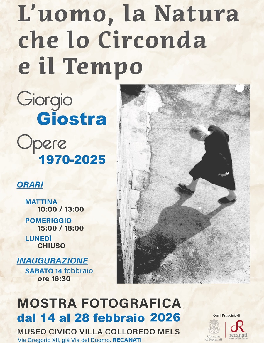 Giorgio Giostra nasce a Camerano nel 1945; diplomato all’Istituto d’Arte di Ancona e laureato in Scienze dell’Educazione, opera nel campo della fotografia dal 1969 come fotografo professionista, fotoreporter e insegnante di fotografia. Ha esposto in numerose mostre sia in contesti istituzionali che privati. La mostra è patrocinata dal Comune di Recanati e realizzata in collaborazione con i musei civici recanatesi.