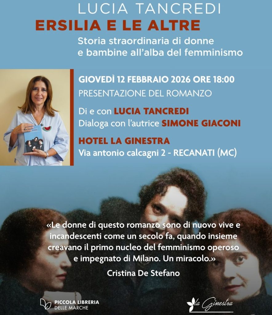Recanati ospita la scrittrice Lucia Tancredi, candidata al Premio Strega 2026 con il libro “Ersilia e le altre” che sarà presentato giovedi 12 febbraio alle ore 18 all’Hotel La Ginestra. L’autrice, in dialogo con Simone Giaconi, svelerà la sua ultima fatica letteraria, una storia straordinaria di donne e bambini all’alba del femminismo.