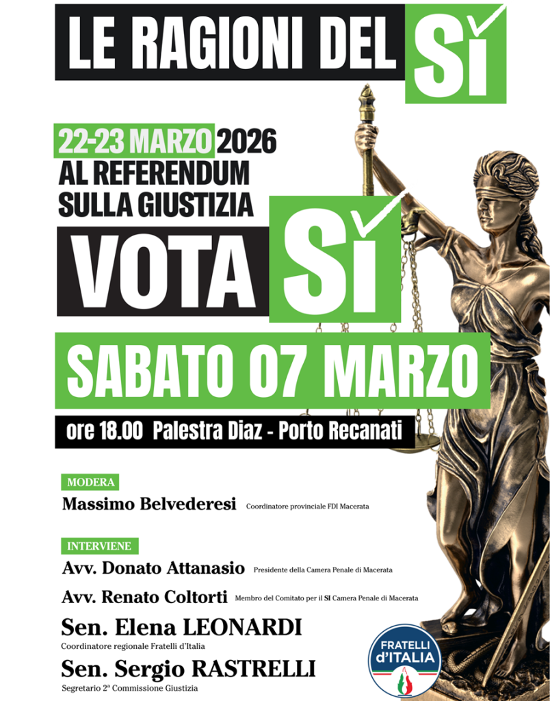 Un momento di confronto aperto alla cittadinanza sui temi della giustizia e sul referendum previsto per il 22 e 23 marzo. È questo l’obiettivo dell’incontro pubblico “Le ragioni del Sì”, in programma sabato 7 marzo alle ore 18.00 presso la Palestra Diaz di Porto Recanati.