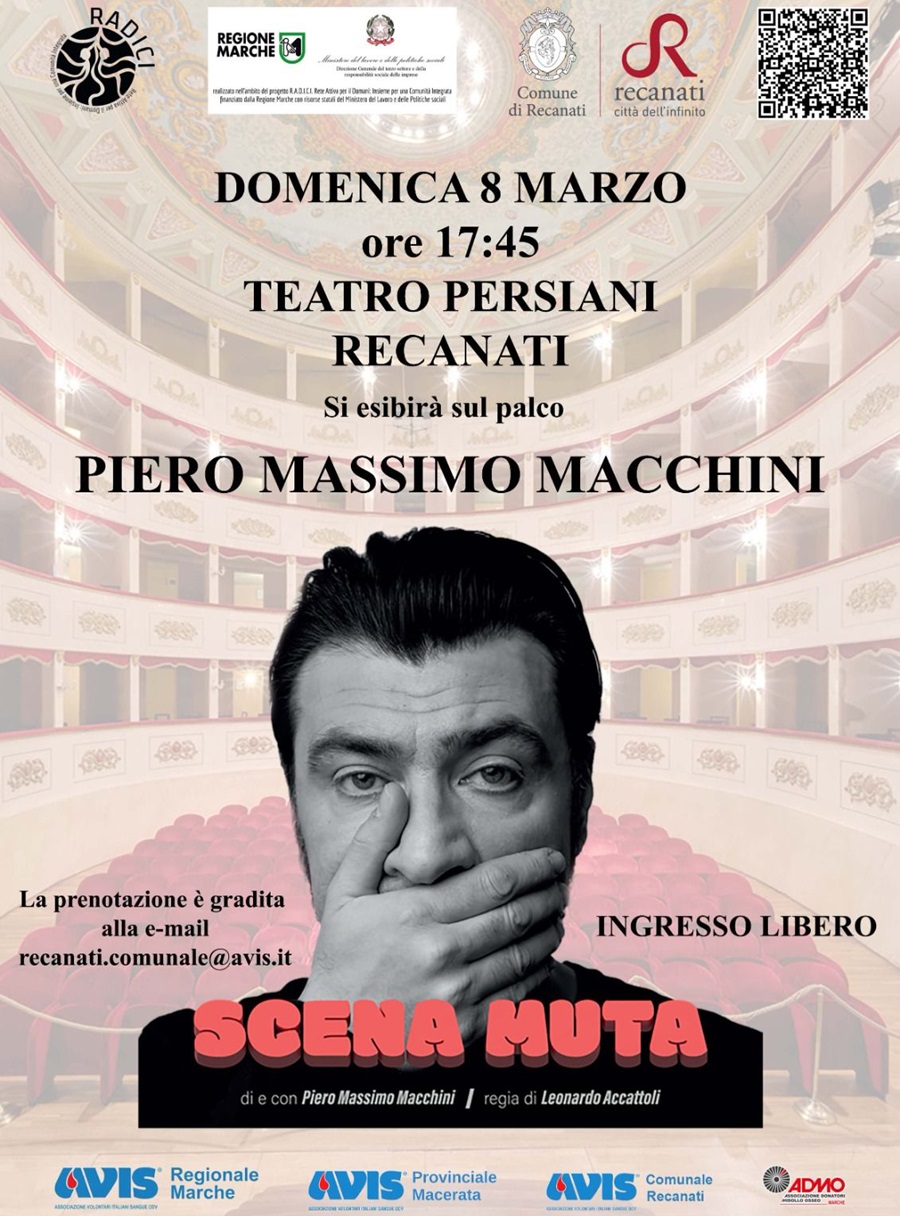 Domenica alle ore 17.45 il sipario del Teatro Persiani si alzerà su “Scena muta”, lo spettacolo di e con Piero Massimo Macchini, diretto da Leonardo Accattoli. L’ingresso è libero, con prenotazione gradita all’indirizzo email recanati.comunale@avis.it.