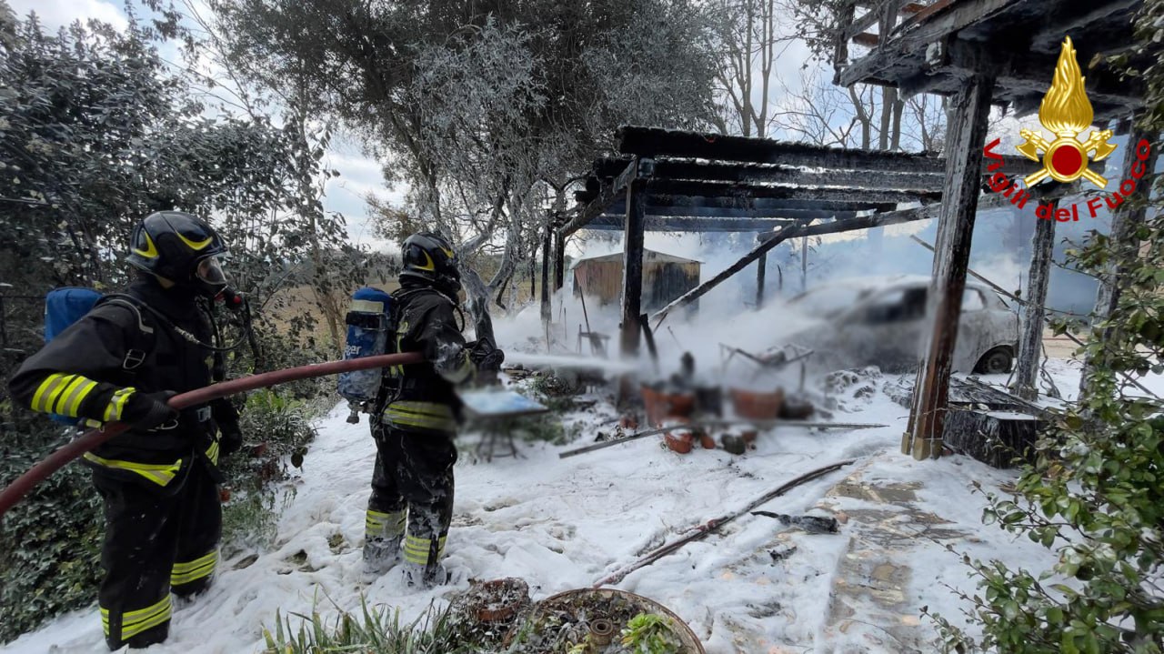 Sul posto è intervenuta una squadra dei Vigili del Fuoco partita dal comando provinciale di Macerata con tre mezzi. Le fiamme hanno interessato un’auto parcheggiata nei pressi della casa, propagandosi anche a un pergolato in legno e a una porzione delle mura esterne dell’edificio.