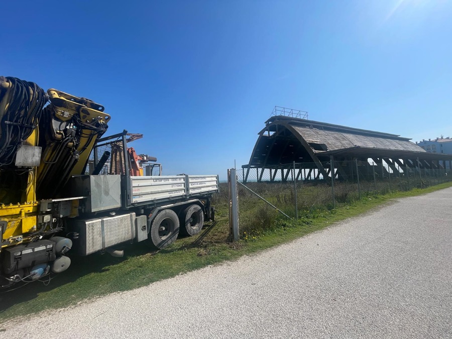 Sono iniziati questa mattina i lavori di asportazione dei materiali caduti al di sotto del Capannone Nervi, affidati alla ditta Unifor s.r.l. di Osimo.