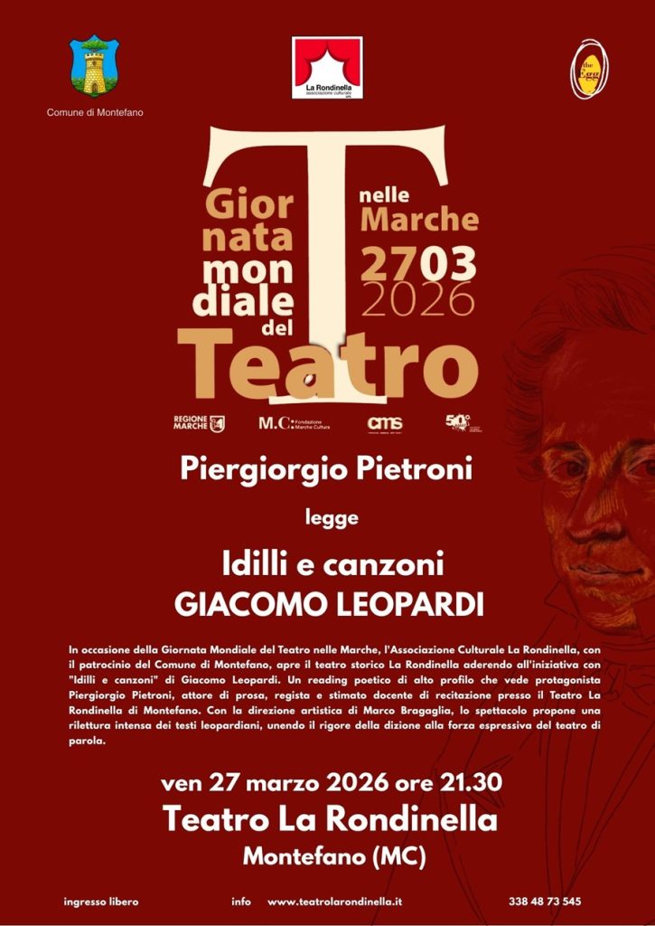 In occasione della Giornata Mondiale del Teatro, il suggestivo Teatro La Rondinella di Montefano apre le sue porte alla cittadinanza per un evento di eccezionale spessore culturale. L’Associazione Culturale La Rondinella, rispondendo con entusiasmo all’invito della Regione Marche, della Fondazione Marche Cultura, dell’AMAT e del Consorzio Marche Spettacolo, propone una serata dedicata alla grande poesia: “Idilli e canzoni” di Giacomo Leopardi.