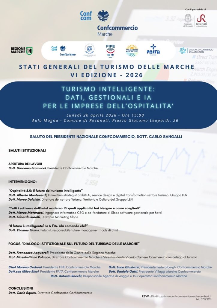 Si tratta di uno degli appuntamenti più rilevanti per il comparto turistico regionale. Gli Stati Generali del Turismo, promossi da Confcommercio Marche, con il patrocinio della Regione Marche e del Comune di Recanati, rappresentano da anni un momento strutturato di confronto tra imprese del settore, esperti, stakeholder e istituzioni sui temi chiave per lo sviluppo e la competitività dell’offerta turistica regionale. Sarà presente anche il direttore di Confturismo Confcommercio nazionale, Carlo Squeri. Un’occasione non solo di analisi, ma di costruzione condivisa di visioni e strategie, in un comparto sempre più esposto a cambiamenti rapidi e profondi.
