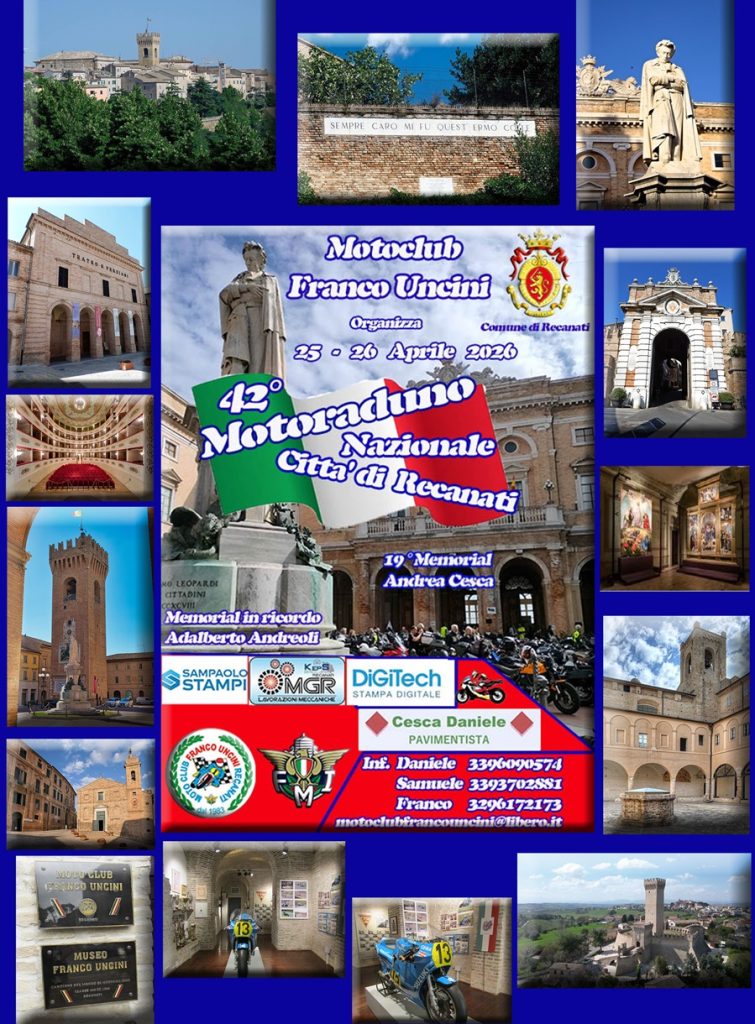 Il rombo dei motori torna a farsi sentire a Recanati, pronta ad accogliere uno degli appuntamenti più attesi dagli appassionati delle due ruote. Sabato 25 e domenica 26 aprile, la suggestiva Piazza Giacomo Leopardi farà da cornice al 42° Motoraduno Nazionale “Città di Recanati”, organizzato dal Motoclub Franco Uncini con il Patrocinio del Comune di Recanati.