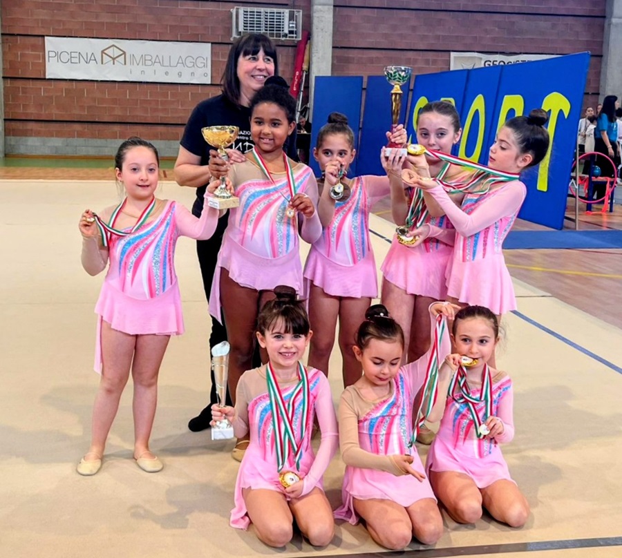 Straordinari anche i risultati di squadra. Il gruppo young cerchio formato da Estiliana Sferrino, Luna Diop, Melissa Gambini, Aurora ed Emma Padalino ha conquistato il primo posto, confermando un’ottima affinità e sincronizzazione. Successo anche per la coppia young palla composta da Emma Padalino e Melissa Gambino, che ha ottenuto la medaglia d’oro.