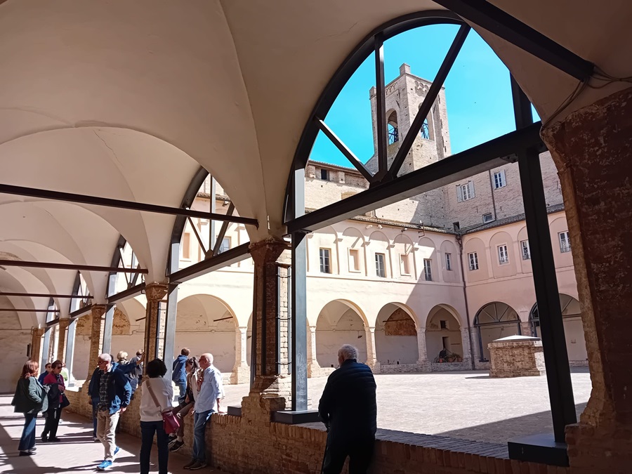 Accanto all’avanzamento del cantiere, resta però aperta un’altra questione legata alla vicenda della scuola. Quando l’istituto fu trasferito temporaneamente nel Chiostro di Sant’Agostino, vennero installati supporti metallici per garantire la sicurezza del porticato dell’ex convento, con l’impegno di rimuoverli entro breve tempo. Quelle strutture, pensate come provvisorie, sono invece rimaste per anni, alterando un contesto architettonico di particolare valore, anche per la presenza della Torre del Passero Solitario e per il richiamo turistico dell’area.